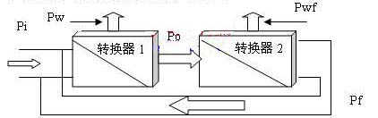 第二種工作模式是引入能量反饋的情況下,能量轉換如圖3所示:轉換器1為需要例行使用的電源轉換器,轉換器2為用於能量反饋的轉換器,Pi為係統外給轉換器1的輸入能量,Pw為轉換器1轉換過程中的消耗能量,Po為例行使用電源轉換器1正常應輸出的能量,同時也是轉換器2的輸入能量;Pwf為用於能量反饋的轉換器2轉換過程中的消耗能量,Pf為轉換器2反饋給電源轉換器1的能量。