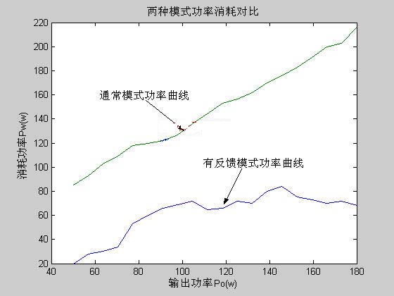 結果分析:在通常工作模式情況下,曲線的波動是由於電能轉換器的轉換效率影響造成的,由前麵原理分析可知消耗功率為Pi=Po+Pw,如果轉換效率為,則Pi=Po/η,轉換效率η通常隨著輸出功率的變化有一定的波動,所以曲線的波動符合理論分析;在有反饋的工作模式情況下,由前麵原理分析部分得係統的消耗功率為Pi=Pw+Pwf,分別設轉換器1的轉換效率為η1,反饋部分的轉換效率為η2,則係統的消耗功率為: