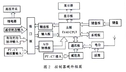 該終端控製器的硬件結構如圖2所示,它的主體是一台STD工控機,采用模板式結構,便於故障檢修。供電線路的電壓、電流經PT、CT變換後經A/D轉換板轉變為數字信號送至V40主板,PT、CT變比經主台設定後下發至該終端,CPU據此計算出線路的實際電壓、電流。脈衝電度表發出的脈衝信號經輸入板送至CPU,根據電表脈衝常數計算出有功及無功功率。KG105型電台接收主台下發的指令,經通訊板送至CPU,然(ran)後(hou)由(you)輸(shu)出(chu)板(ban)控(kong)製(zhi)輸(shu)出(chu)繼(ji)電(dian)器(qi)的(de)動(dong)作(zuo),進(jin)而(er)實(shi)現(xian)遙(yao)控(kong)跳(tiao)合(he)閘(zha)操(cao)作(zuo)。遠(yuan)程(cheng)抄(chao)表(biao)是(shi)由(you)電(dian)台(tai)經(jing)通(tong)訊(xun)板(ban)采(cai)集(ji)威(wei)勝(sheng)表(biao)中(zhong)的(de)數(shu)據(ju)實(shi)現(xian)的(de),而(er)召(zhao)測(ce)數(shu)據(ju)則(ze)是(shi)采(cai)集(ji)CPU中計算出的數據。CPU每隔1min采集1次數據,所有計算結果保存在係統板上的SRAM中,可保存24小時的數據,因此主台第二天必須將第一天的數據召測回中心站的數據庫中,否則第一天的數據將丟失。