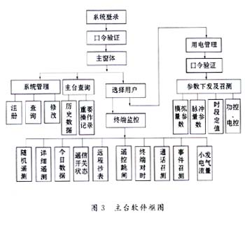 該無線電力負荷控製係統的管理軟件是用麵向對象的編程工具VisualBasic6.0開發完成的,係統軟件框圖如圖3所示。係統啟動後要求輸入操作員工號及口令,驗證無誤後連接電台,進入主窗體。