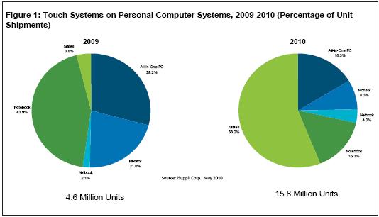 最近幾年,個人電腦市場對於觸摸屏的需求不斷增長,2008和2009年增長率超過20%,快於總體係統市場。但與該市場2010年462%的增長率相比,上述增長速度就相形見絀了。平板觸摸電腦是PC觸摸革命中的主要初期推動者,預計占PC觸摸市場的比例將從2009年的3.8%銳升到56.2%,而總體PC觸摸市場規模將擴大兩倍。
