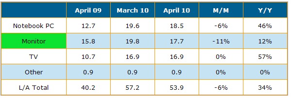 Source: DisplaySearch April 2010 Monthly TFT LCD Shipment Database