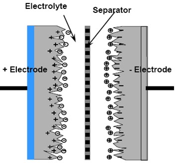 超chao級ji電dian容rong器qi可ke以yi被bei視shi為wei在zai兩liang個ge極ji板ban外wai加jia電dian壓ya時shi被bei電dian解jie液ye隔ge開kai的de兩liang個ge互hu不bu相xiang關guan的de多duo孔kong板ban。對dui正zheng極ji板ban施shi加jia的de電dian勢shi吸xi引yin電dian解jie液ye中zhong的de負fu離li子zi,而er負fu麵mian板ban電dian勢shi吸xi引yin正zheng離li子zi。這zhe有you效xiao地di創chuang建jian了le兩liang個ge電dian荷he儲chu層ceng,在zai正zheng極ji板ban分fen離li出chu一yi層ceng,並bing在zai負fu極ji板ban分fen離li出chu另ling外wai一yi層ceng。