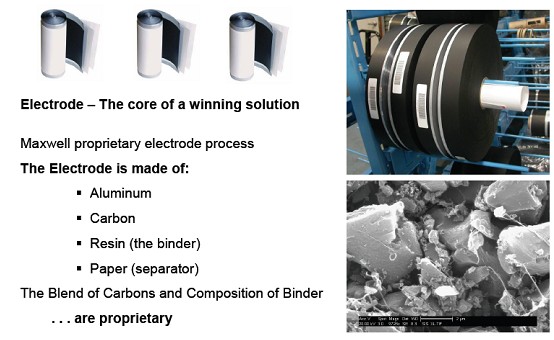 如上圖2所示,為Maxwell超級電容的電極,這被認為是他們超級電容器技術的最關鍵部分。這個電極是由鋁,碳元素製成,其中樹脂作為粘合劑,紙作為隔膜。