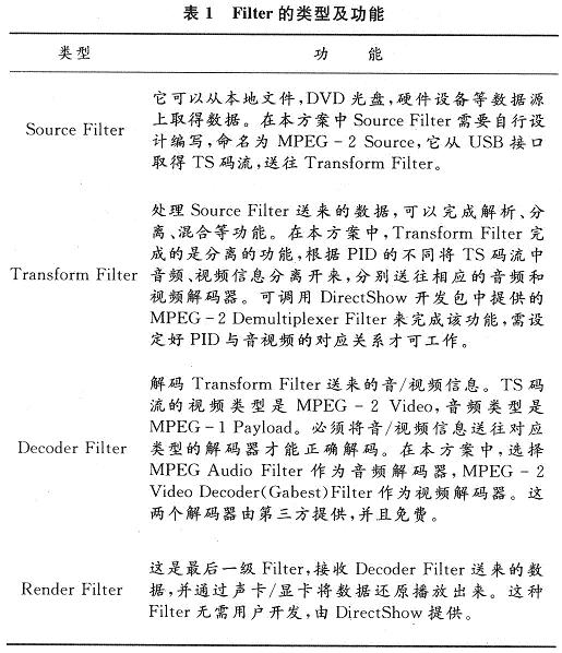 (2)搭建實時媒體播放器,將所接收到的TS碼流解碼播放。這是PC機應用程序的核心部分。在選擇搭建實時媒體播放器的策略上有兩種方法:一是利用開源的播放器進行修改,但絕大多數開源播放器都是基於Linux平台下編寫的,要在Windows平台下使用需要經過移植才行,移植工作量很大,且移植後播放器穩定性較難控製。另一個是基於DirectShow技術,自行編寫播放器。DirectShow是微軟DirectX家族中的成員,與Windows有著天然的“血緣”關係,是Windows平台下搭建媒體播放器的最佳選擇。並且微軟提供了相應的開發套件,使得開發工作量得以減少,開發周期大大縮短。基於以上原因,本方案選擇基於DirectShow技術搭建實時媒體播放器。