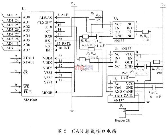 選用芯片82C250作為CAN控製器和物理總線間的驅動接口,可以提供對總線的差動發送能力和對CAN控製器的差動接收能力,其最高速可達1Mb/s。由於實際係統中存在幹擾,故增加高速光隔6N137,以起到隔離的作用。電氣接口很簡單,有CANH和CANL兩根線,用以完成CAN的數據傳輸。在CAN總線的兩端有一個120Ω的電阻,其作用為匹配總線阻抗,用於提高數據通信的抗幹擾性及可靠性。具體電路如圖2所示。