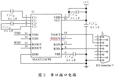 RS232標準是美國電子工業聯合會(EIA)製定的一種串行物理接口標準,它適合於數據傳輸率在O~20000b/s範圍內的通信,目前廣泛用於計算機與終端或外設之間的近端連接。實際工作時,應保證電平在5~15V之間。所以為了與單片機進行通信。必須對其電平進行轉換。現在常用的轉換芯片是MAX232。MAX232內部有電壓倍增電路和轉換電路,隻需5V電源便可實現TTL電平與RS232電平的轉換,使用十分方便。串口接口電路如圖3所示。