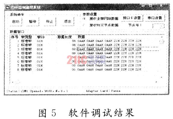 命令幀共6個字節,傳輸方向為PC機到單片機。以0X00H作為幀起始,數據長度為2,當數據1和數據2同為0X00時,表示啟動接口卡,單片機接收到該信號後.會初始化SJA1000,並將結果反饋給PC機(成功或失敗);當數據1和數據2同為0XFFH時,表示要求接口卡停止工作,單片機會讓SJA1000進入睡眠模式,以退出總線;當數據1為0X01H時,表示PC機要求隻接收某個節點的數據,數據2則表示該接點的節點號,單片機會重新設置SJA1000的驗收濾波器,屏蔽掉其他不需要的節點數據。