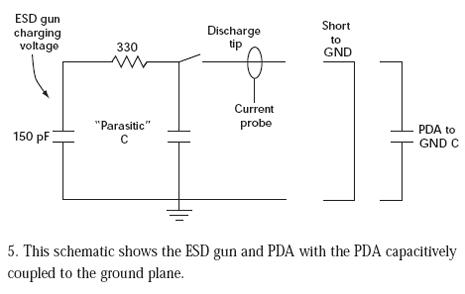 向PDA的放電通過一個並行平板電容表示,其中一個極板是PDA的一部分,另一個極板是接地板。在脈衝初期,PDA電容提供較低的阻抗,注入進PDA的電流近似於到地的放電電流。繼續施加脈衝,電荷在PDA到接地板電容中累積,因此PDA上的電位上升,直到PDA和接地板之間的電位和150pF電容上的電壓相等。這時,不再有電流流動,即使ESDqiang的電容還沒有完全放電。