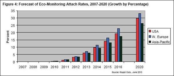 圖4所示為2007-2020年(百分比增長率)節能監測功能配售率在美國、西歐和亞太地區配售率的增長情況預測。節能監測是發展較快的節能輔助駕駛應用之一。
