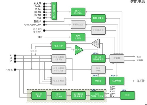 安森美半導體應用於智能電表的方案包含一係列標準產品、專用標準產品(ASSP)及專用集成電路(ASIC),可以提供智能電表的4種基本功能,包括:電源/電源管理、計量、寄存及通信。圖2是由安森美半導體的多種器件(圖中綠色部分)構成的智能電表應用。