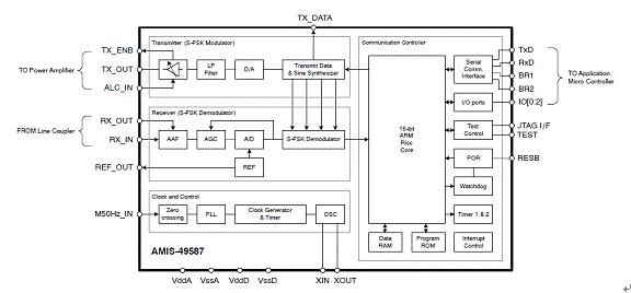 AMIS-49587符合IEC1334標準,有助於簡化設計、降低開發及應用成本,並加速上市進程。該器件基於ARM7TDMI處理器內核,包含物理接口收發器(PHY)和媒體訪問控製器(MAC)層,而大多數競爭方案都需要複雜的嵌入式軟件來執行與AMIS-49587相同的功能。該器件采用擴頻型移頻鍵控(S-FSK)調製技術,結合精確的濾波,為長距離電力線提供可靠的低數據率通信,以及2,400 bps(波特)的半雙工可調節通信速率。不到20千赫(kHz)的低工作頻率配以自動中繼器(repeater)功能,令通信更可靠,通信誤差比其他及現有方案更低。圖3是AMIS-49587的方框圖。