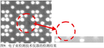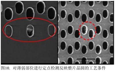 自(zi)動(dong)工(gong)藝(yi)檢(jian)測(ce)技(ji)術(shu)是(shi)對(dui)電(dian)子(zi)束(shu)檢(jian)測(ce)技(ji)術(shu)補(bu)充(chong)。在(zai)實(shi)際(ji)生(sheng)產(chan)過(guo)程(cheng)中(zhong),常(chang)常(chang)能(neng)發(fa)現(xian)通(tong)孔(kong)刻(ke)蝕(shi)的(de)一(yi)些(xie)係(xi)統(tong)性(xing)缺(que)陷(xian),它(ta)主(zhu)要(yao)由(you)於(yu)刻(ke)蝕(shi)設(she)備(bei)及(ji)其(qi)工(gong)藝(yi)在(zai)調(tiao)試(shi)過(guo)程(cheng)中(zhong)還(hai)沒(mei)達(da)到(dao)最(zui)好(hao)的(de)工(gong)藝(yi)窗(chuang)口(kou),或(huo)者(zhe)工(gong)藝(yi)窗(chuang)口(kou)的(de)漂(piao)移(yi)使(shi)刻(ke)蝕(shi)設(she)備(bei)的(de)一(yi)些(xie)薄(bo)弱(ruo)部(bu)位(wei)提(ti)前(qian)顯(xian)現(xian)在(zai)通(tong)孔(kong)刻(ke)蝕(shi)工(gong)藝(yi)過(guo)程(cheng)中(zhong)。實(shi)驗(yan)過(guo)程(cheng)中(zhong)通(tong)過(guo)對(dui)一(yi)顆(ke)產(chan)品(pin)的(de)薄(bo)弱(ruo)部(bu)位(wei)進(jin)行(xing)定(ding)點(dian)檢(jian)測(ce),來(lai)反(fan)映(ying)整(zheng)片(pian)晶(jing)圓(yuan)的(de)工(gong)藝(yi)條(tiao)件(jian)(如圖10所示)。