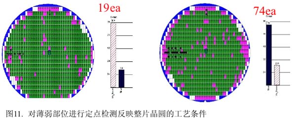 最zui終zhong的de實shi驗yan證zheng明ming自zi動dong工gong藝yi檢jian測ce結jie果guo與yu最zui終zhong良liang率lv的de對dui應ying關guan係xi。表biao明ming自zi動dong工gong藝yi檢jian測ce可ke以yi反fan映ying存cun儲chu單dan元yuan內nei接jie觸chu孔kong通tong孔kong刻ke蝕shi的de狀zhuang態tai。對dui於yu在zai生sheng產chan線xian上shang檢jian驗yan到dao薄bo弱ruo部bu位wei有you刻ke蝕shi不bu完wan全quan比bi較jiao多duo的de晶jing圓yuan,其qi對dui應ying的de正zheng常chang存cun儲chu單dan元yuan內nei也ye有you較jiao多duo的de接jie觸chu孔kong有you刻ke蝕shi不bu完wan全quan問wen題ti。可ke以yi通tong過guo對dui產chan品pin的de薄bo弱ruo部bu位wei進jin行xing監jian測ce達da到dao對dui正zheng常chang存cun儲chu單dan元yuan內nei接jie觸chu孔kong刻ke蝕shi狀zhuang態tai的de實shi時shi反fan映ying,這zhe對dui接jie觸chu孔kong的de刻ke蝕shi工gong藝yi改gai進jin有you極ji大da的de促cu進jin作zuo用yong(如圖11所示)。