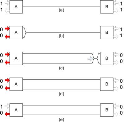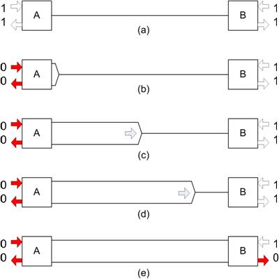 我們的下一種情況(圖2)假設,節點A再次發起一條消息,但是節點B在稍後發起的一條消息具有更高的優先級。如前所述,這種情況以兩個節點均處在非占用模式作為開始,如(2a所示,隨後節點A變為占用(如(2b)所示)發起一條消息。該占用差動電壓再次沿線纜傳輸。在信號到達B處的收發器以前,該節點剛好利用如(2c)所示占用位發起一條消息。這時,兩個節點都正傳輸一個占用位,並且兩個節點都正接收一個占用位(如(2d)所示),然後兩個節點都沒意識到另一個節點也已啟用。由於在我們的假設情況中,節點A具有比節點B更低的優先級,因此有時節點A會通過將其TXD設置為0(如(2e)所示)來發出一個非占用位。但是,由於節點B的作用,RXD會感應到總線仍然處在占用狀態下。