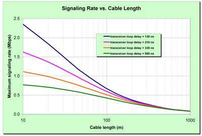 下麵顯示了信號速率和線纜長度之間的權衡因素,以及收發器延遲帶來的影響。收發器帶來的延遲(包括相關隔離、電平轉換和保護)對於500kbps及以上的信號速率特別明顯。