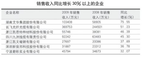 由於2009年受到國際金融危機的打擊,許多元件百強企業的生產經營受到極大影響。僅有35家企業的銷售收入增長超過10%,比上屆的41家還少,更遠低於第21屆時的65家。僅有湖南艾華集團股份有限公司、長飛光纖光纜有限公司兩家企業的2009年銷售收入同比增幅超過50%,分別增長了75.55%和51.23%。而上一屆,銷售收入同比增幅超過50%的企業有7家。值得一提的是四川九洲線纜有限責任公司,2008年的銷售收入增長110.16%,2009年的銷售收入增長45.30%,兩年間的平均增長率達到74.75%,獲得如此驚人的發展速度十分難得。