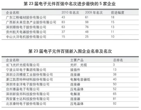 國際金融危機造成的企業經營上的波動反饋到了第22屆、23屆元件百強的榜單上。在近兩屆的榜單之中,均有20家左右企業的名次出現了10位以上(含10位)的較大波動,去年23家,今年20家。據估計,如果國際國內的經濟形勢能保持穩定,在未來一兩年內,元件百強榜單中,名次出現大起大落的企業數量將會減少。