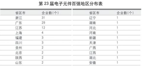 新一屆元件百強的地區分布格局並沒有出現大的變化,100家企業分布在我國20個省、市、自治區。浙江、廣東、江蘇3省仍然是元件百強企業最為集中的地方,企業數分別為31家、29家和12家。長三角地區的江、浙、滬3省市以47席幾乎占據元件百強企業的半壁江山。