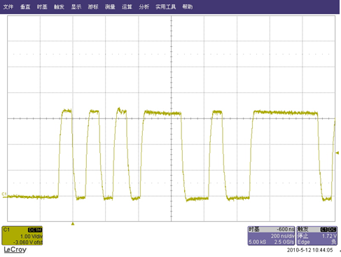 由you於yu這zhe些xie通tong信xin數shu據ju量liang的de加jia大da是shi突tu發fa出chu現xian的de,用yong手shou動dong抓zhua到dao的de突tu發fa數shu據ju量liang波bo形xing很hen難nan剛gang好hao在zai時shi基ji觸chu發fa點dian附fu近jin,這zhe樣yang波bo形xing放fang大da後hou我wo們men需xu要yao觀guan察cha的de區qu域yu可ke能neng會hui無wu法fa滾gun進jin屏ping幕mu裏li,即ji使shi能neng滾gun進jin屏ping幕mu裏li,放fang大da後hou的de波bo形xing也ye可ke能neng由you於yu時shi基ji、采樣等原因而失真的比較嚴重。而在一般情況下,我們都是考慮把觸發電平設置在如下圖“正統”的波形範圍裏,但這樣也就抓不到“飛鳥”了: