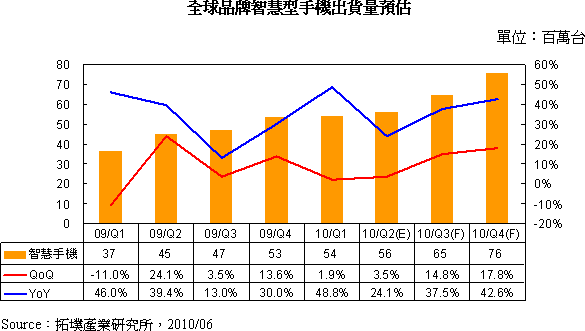 受到新興市場換機潮與新用戶的加入,以及成熟歐美市場新規格、新應用的持續推出等因素激勵,拓墣產業研究所預估2010年全球品牌手機出貨量可望達13.29億支,較2009年成長11.7%,2010下半年出貨表現將優於上半年,通訊產業研究中心謝雨珊副理分析,在智慧型手機快速低價化、iPhone 4上市之下,促使品牌廠相繼推出新款智慧型手機搶市,預估2010年全球智慧型手機出貨量為2.51億支,年成長率達37.9%,連續三年以超過30%以上高成長率攻占市場,2011年全球智慧型手機出貨量更挑戰4億支關卡,滲透率將從2010年的18.9%,攀升至2011年的27.6%,屆時每四款手機中即有一款是智慧型手機。