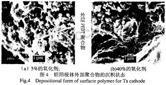 對(dui)於(yu)二(er)步(bu)法(fa)生(sheng)產(chan)工(gong)藝(yi),單(dan)體(ti)為(wei)聚(ju)合(he)反(fan)應(ying)過(guo)程(cheng)中(zhong)的(de)過(guo)量(liang)一(yi)方(fang),聚(ju)合(he)物(wu)生(sheng)成(cheng)的(de)量(liang)由(you)氧(yang)化(hua)劑(ji)的(de)量(liang)來(lai)決(jue)定(ding),聚(ju)合(he)物(wu)在(zai)鉭(tan)芯(xin)表(biao)麵(mian)的(de)沉(chen)積(ji)數(shu)量(liang)隨(sui)氧(yang)化(hua)劑(ji)含(han)量(liang)的(de)增(zeng)加(jia)而(er)增(zeng)加(jia)。從(cong)圖(tu)3可以看出,在相同的浸漬次數下,使用含量為5%的氧化劑陽極塊的質量增加為0.54%,而使用含量為40%的氧化劑陽極塊質量增加為3.52%,因此高含量的氧化劑可以有效增加聚合物的沉積量。