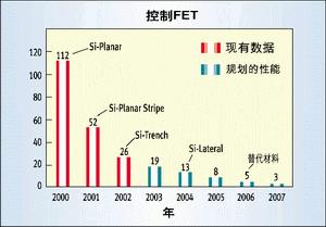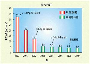 圖2所示的是同步或稱低端(low-side)FET的品質因數。在這裏,實際上是傳導損耗主宰了處在導通電阻時域的品質因數。僅在過去的兩年中,通過將1至2微米溝道技術升級為深亞微米水平,就使品質因數提高了約3倍,今後還有更多的改進餘地。