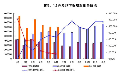 1. 1.6升及以下排量乘用車銷量增速回落明顯 上半年,1.6升及以下排量乘用車銷售462.55萬輛,占乘用車銷量的68.83%,市場占有率同比下降2個百分點;銷量同比增長44%,低於汽車銷量市場4個百分點。其中,1、2季度銷量同比增長分別為77%、19%,2季度比1季度增速回落58個百分點。