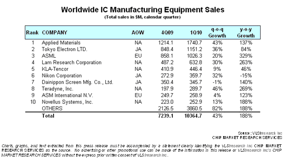 2009年的Q1,在全球金融危機的大環境下,半導體產業經曆了史無前例的downturn。時隔一年,設備行業較上年Q1的增長達到了 188%。 VLSI預計2010年全年設備行業總銷售額將達到476億美元,較2009年增長95.8%,接近2000年480億美元的業界近20年最高鋒。