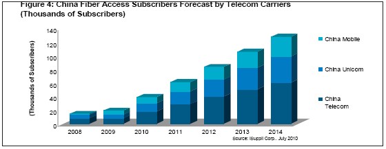 圖4所示國iSuppli公司對於2008-2014年各家運營商的光纖接入用戶數量預測。