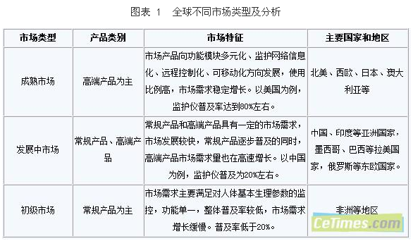 醫療設備的發展與國家和地區的經濟發展水平、醫(yi)療(liao)政(zheng)策(ce)以(yi)及(ji)當(dang)地(di)居(ju)民(min)收(shou)入(ru)水(shui)平(ping)息(xi)息(xi)相(xiang)關(guan),這(zhe)些(xie)因(yin)素(su)導(dao)致(zhi)全(quan)球(qiu)醫(yi)療(liao)監(jian)護(hu)儀(yi)市(shi)場(chang)發(fa)展(zhan)不(bu)平(ping)。根(gen)據(ju)市(shi)場(chang)特(te)征(zheng)以(yi)及(ji)對(dui)產(chan)品(pin)需(xu)求(qiu)的(de)不(bu)同(tong)可(ke)以(yi)將(jiang)醫(yi)療(liao)監(jian)護(hu)儀(yi)市(shi)場(chang)分(fen)為(wei)成(cheng)熟(shu)市(shi)場(chang)、發展中市場和初級市場。