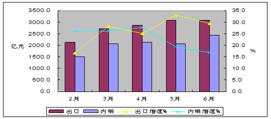 五、內外銷保持同步增長,出口繼續快於內銷。今年以來,隨著外需不斷回暖,外銷出現持續增長,到5月底,全行業累計外銷增速開始超過內銷,進入6月份,外銷增速優勢進一步加強,超過內銷增速4個百分點。其中,內銷產值11975.5億元,同比增長27.2%;出口交貨值16647.1億元,同比增長31.2%,高於產業平均增速1.7個百分點。產業出口依存度(58.1%)比去年同期提高0.7個百分點,比前5個月下降0.6個百分點。