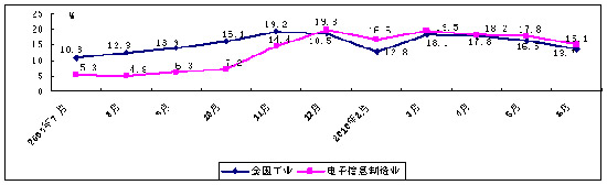 圖1 2009年7月至今規模以上電子信息製造業與全國工業增加值增速對比
