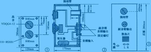 功放電路安裝在右聲道音箱中,因此左右兩個音箱的後麵板布局有較大的差異。倒相管長度以及主音箱側麵視圖如圖2所示。主音箱背麵視圖如圖3所示。