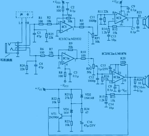IC1及周圍元件組成緩衝放大級,電路增益=R4/(R1+R2)=50/(10+0.1)≈5倍。為了避免在電腦關機後,在聲卡停止工作時,前置放大器輸入端懸空,處於高阻抗輸入狀態,將感應到的50Hz交流電信號送到後級電路放大,從而在揚聲器中出現較強的噪聲,特設置了22kΩ電阻R25、R26,這樣不但可以將輸入阻抗限製在22kΩ,避免前置電路工作在高阻抗狀態,還可以對50Hz感應信號進行有效的抑製,提高整機信噪比。