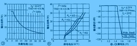 LM1876的負載範圍很寬,在4~30Ω的範圍內均能穩定地工作,其輸出功率與負載的對應關係如圖5所示。LM1876的供電電壓範圍為±10~±25V,當供電電壓降低時,影響的隻是輸出功率的大小,而對其他指標影響不大,供電電壓與輸出功率的對應關係如圖6所示。LM1876的6、11腳為左/右聲道靜噪控製端,當這幾腳接高電平(高於1.6V)時,LM1876內部電路執行靜音操作,切斷輸出端的音頻信號(如圖7所示)。因此可以在這些引腳中與正電壓之間接一個RCyanshiwangluo,shiqizaikaijishunjianweigaodianping,shuchudianluwuyinpinxinhaoshuchu,yanshiyiduanshijianhou,zaizhengchangshuchu,yidadaobimiankaijishunjianshuchuduandianweishixieduiyangshengqidechongji。zaitu4中,晶體管VT1、R24、C16、R20、C15即為開機延時網絡,調整它們的取值範圍,可以改變延時時間的長短,從而獲得滿意的開機延時時間。
