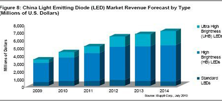 另外,憑借政府的支持和LED日益進入液晶電視及普通照明等新的應用領域,iSuppli公司預測,2014年中國LED營業收入將達到71億美元,而2009年是34億美元,其間的複合年度增長率為12.8%。超高亮度(UHB)LED的增長速度更快,到2014年銷售額將從2010年的6.86億美元上升到18億美元,複合年度增長率為26.9%。