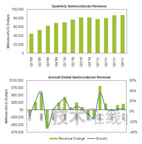 iSuppli從正麵否定了對於此次快速增長所擔心的“泡沫”和“二次探底”。關於泡沫問題,有觀點認為,此前曾創下曆史最高增長率的2000年出現了需求泡沫,所以此次的增長會不會也是泡沫。但是,iSuppli指出,2000年的增長是繼1999年經濟繁榮之後的產物,而此次增長的背景卻是經濟形勢從2009年以前的經濟低迷期開始的複蘇,因此這兩種情況“在循環本質上完全不同”。關於二次探底,iSuppli高級副總裁戴利·福特(Dale Ford)表示,“我不同意二次探底將要到來的觀點”。他認為,從2010年下半年開始,2010年半導體市場將恢複到通常模式。也就是說,2010年第二季度將環比增加8.2%,達到峰值,第三季度將環比增加6.7%、第四季度將環比增加0.4%,出現減速,進入2011年後,由於通常的季節因素,將轉為環比負增長。iSuppli預測,回到這種標準增長模式後,2011年的半導體市場將增長7%。