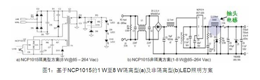 1W至8W的低功率LED通用照明應用包括G13、GU10、PAR16、PAR20和嵌燈等。這類應用的輸入電壓範圍在交流90至264 V之間,恒流輸出電流包括350 mA和700 mA兩種,能效要求為80%,還要求提供短路和過壓保護等特性。這類應用可以采用安森美半導體的NCP1015自供電單片開關控製IC。該器件集成了固定頻率(65/100/130 kHz)電流模式控製器和700 V的高壓MOSFET,具備構建強固的低成本電源所需的全部特性,如軟啟動、頻率抖動、短路保護、跳周期、最大峰值電流設定及動態自供電功能(無需輔助繞組)等。NCP1015既可用於隔離型方案,也可用於非隔離型方案,見圖1。
