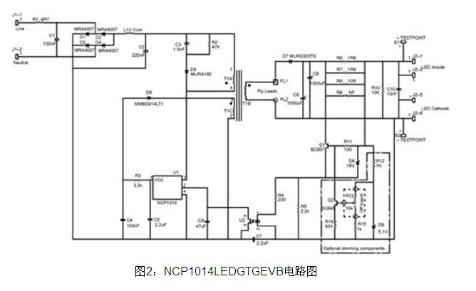 安森美半導體的NCP1014LEDGTGEVB評估板可驅動1至8顆大功率高亮度LED。該設計基於集成了帶內部限流功能的高壓電源開關的緊湊型固定頻率脈寬調製(PWM)轉換器NCP1014構建。由於NCP1014采用固定頻率工作,電流不能上升到高於某個特定點;導通時間的限製使輸入電流將跟隨輸入電壓的波形,從而提供更高的功率因數。評估板電路圖見圖2。