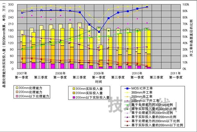 晶圓處理能力方麵,半導體整體為同比(YoY)減少0.2%,環比(QoQ)增長0.6%,MOS IC整體為同比增長0.1%,環比增長0.6%,繼續持平。旨在從0.12~0.06μm生產線向0.06μm以下生產線過渡的細微化投資十分活躍,但是為擴大晶圓處理能力的增產投資卻稍顯遜色:qichongdilelaoshengchanxianfeiqidaozhidejingyuanchulinenglixiajiang。zengchantouzideshishi,congbandaotichangshangdeqiyexingtaikan,zhuyaoshiguidaigongchangshang,congjingyuanzhijinglaikan,zhuyaomianxiang300mm晶圓進行。而在矽代工廠商之外的垂直整合型半導體廠商(IDM)因進行重組,廢棄了200mm以下的量產線。