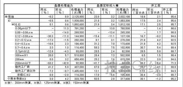 綜上所述,半導體整體的量產線開工率為YoY增18.6個百分點,QoQ增2.1個百分點,達到95.6%,MOS IC整體為YoY增17.1個百分點,QoQ增長2.5個百分點,達到95.7%,均超過了95%。尤其是需求量較大的80nm以下工藝、300mm晶圓以及矽代工廠商的開工率更是達到了超過98%的“超滿負荷運轉”狀態。