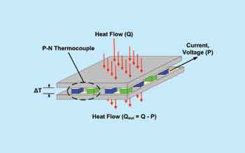 熱電器件的核心組件是一組熱電偶,它包括一個N型與一個P型半導體,兩者由金屬板相連。在P與N型材料對端的導電連接構成了一個完整電路。
