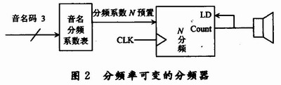 因此若采用模值和輸入脈衝頻率都可控的計數器實現信號分頻,可根據音程碼選擇分頻計數器的輸入脈衝頻率fs、根據音名碼控製分頻計數器的模值N,如圖2所示。