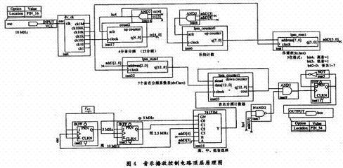 根據設計電路原理框圖,曲譜碼以分頻數編碼,音高信號分頻由一個可預置的模N計數器實現。分頻係數表和曲譜表都存儲在ROM中。若希望控製蜂鳴器的信號占空比為50%,分頻器的輸出信號采用二分頻電路實現占空比整形,但注意信號頻率被降低一半。電路原理框圖中M分頻器的作用是產生合適的時值計數脈衝頻率。電路的頂層原理圖如圖4所示。