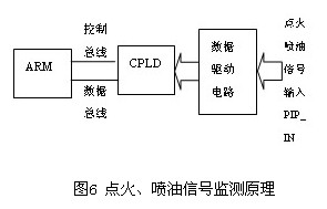 點dian火huo和he噴pen油you信xin號hao是shi汽qi車che發fa動dong機ji中zhong的de關guan鍵jian信xin號hao,其qi周zhou期qi和he時shi序xu直zhi接jie關guan係xi到dao汽qi車che的de運yun行xing狀zhuang態tai,因yin此ci監jian測ce它ta們men的de周zhou期qi和he時shi序xu尤you為wei重zhong要yao。本ben係xi統tong監jian測ce原yuan理li圖tu如ru圖tu6 所示,對於點火信號的監測,主要是監測它與CPS信號的同步,以及兩個或四個點火信號之間的時序關係。當CPLD尋找到點火信號與CPS同步的起始點後,根據輸入的PIP_IN信號,對各點火信號進行計數。每當一個點火周期完成後,在下一個點火周期向ARM 單片機產生一個中斷信號。該中斷信號觸發ARM 單片機進入中斷處理程序,在該中斷程序中,ARM單dan片pian機ji讀du入ru對dui各ge點dian火huo信xin號hao的de計ji數shu值zhi,判pan斷duan點dian火huo信xin號hao的de時shi序xu和he周zhou期qi,並bing設she置zhi點dian火huo信xin號hao正zheng常chang與yu否fou的de標biao誌zhi。對dui於yu噴pen油you信xin號hao的de監jian測ce,主zhu要yao是shi監jian測ce它ta與yuCPS信號的同步,以及它們之間的時序關係。當PIP_IN信號中四個噴油信號中任何一個信號的下降沿到來時,CPLD都會監測其它三個噴油信號的狀態,如果其它三個噴油信號的狀態正常,即給出噴油信號正常標誌,反之給出噴油信號異常標誌。