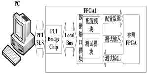 係統功能的實現包括軟件和硬件兩部分。硬件部分包含PCI橋接芯片、FPGA1中的數據接口模塊、配置模塊、測試模塊和被測FPGA。軟件部分包含對實現FPGA配置部分的代碼和實現FPGA測試部分的代碼。FPGA1中的各硬件模塊通過EDA軟件以JTAG接口固化FPGA1中,其中FPGA1中的配置模塊負責接收來自PC方軟件發送的配置數據,並產生對被測FPGA的配置時序,完成配置步驟,測試模塊負責發送測試激勵和回收被測FPGA的響應數據,等待PC方軟件的回收。