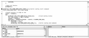 以配置開始指令的發送為例,從圖3圖4兩圖中可以看出軟硬件交互過程中的指令發送方式,在VC++中單步調試,發送一個開始指令0x01到配置命令寄存器地址0x01,通過硬件模塊的接口動作,用嵌入式存儲器SignalTapII中捕捉到LA的數據為1h,LD上的數據為1h後ConfigStart寄存器置高,配置開始。