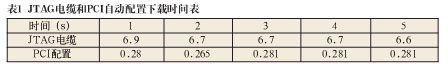 為了對比基於PCI總線的FPGA高速配置方案與基於ByteBlasterIIJTAG下載電纜的速度性能,首先使用QuartusII7.1軟件采用JTAG方式對FPGA2配置5次,計算每次下載所示時間,得到如表1中所示的數據;再使用本係統中基於PCI總線的配置功能對FPGA2配置5次,軟件會自行計算總的下載時間,得到如表1中所示的數據: