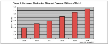 預計2011年消費電子產品出貨量將達到16億個,而2010年是15.6億個。消費電子包括多種我們熟悉的產品,消費者每天都會用到,如電視、立體聲和音頻部件、便攜媒體播放器、機頂盒、遊戲機、DVD和藍光播放器、數碼相機、投影儀和攝像機、數字相框、電子書閱讀器和消費電器。